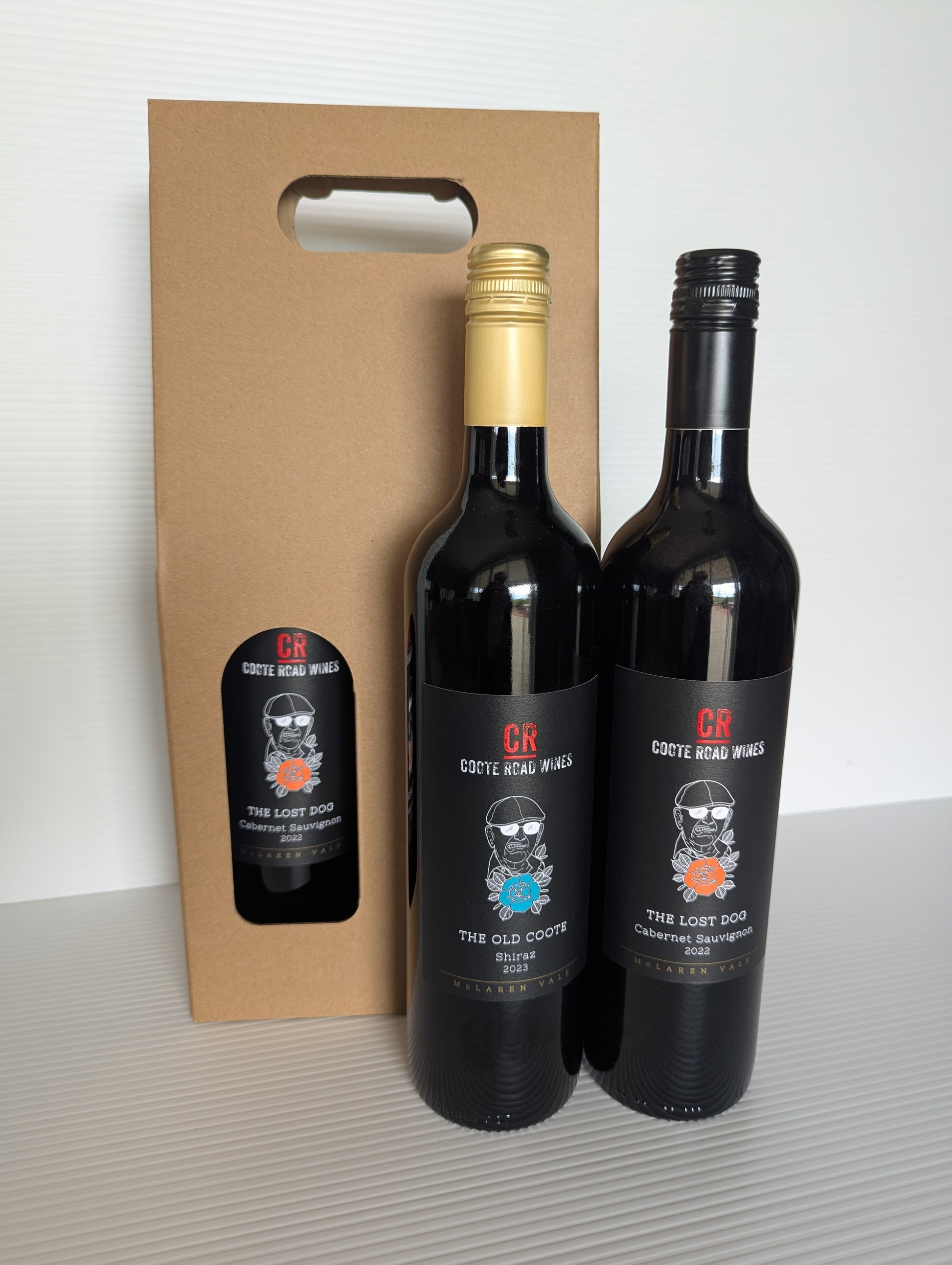 This Gift Box includes a bottle of The Lost Dog - Single Vineyard Cabernet Sauvignon, Spicy & Earthy, Hand plunged & Basket Pressed as well as a bottle of The Old Coote - Single Vineyard Shiraz, Delicate & Bold, 10 months in American & French Oak' Hand plunged & basket pressed from Coote Road Wines.