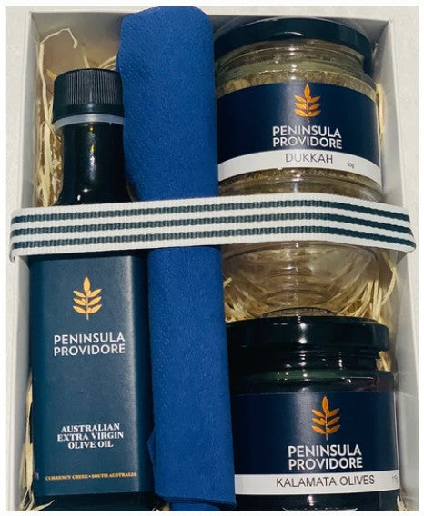 A sensational picnic pack including Peninsula Providore Extra Virgin Olive Oil 100ml, a small dukkah, and small Mixed Olives. We have also included some little bowls and serviettes, so you just need to grab a loaf of crusty bread and you are set!